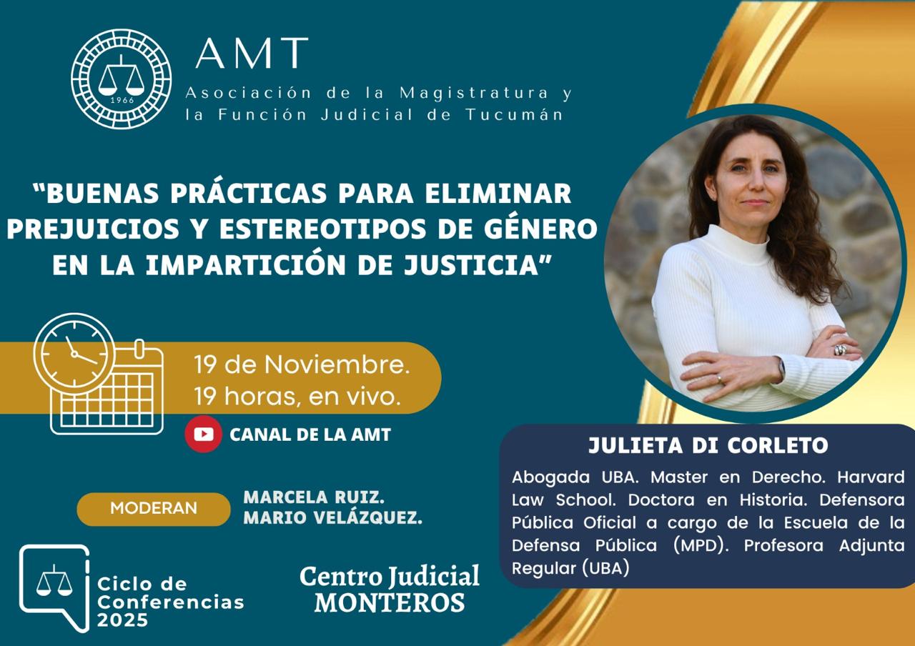 En la sexta edición del Ciclo de Conferencias de la Asociación de la Magistratura y la Función Judicial de Tucumán (AMT) junto al Centro Judicial Monteros, tendremos la actividad titulada «Buenas prácticas para eliminar prejuicios y estereotipos de género en la impartición de justicia» a cargo de Julieta Di Corleto.