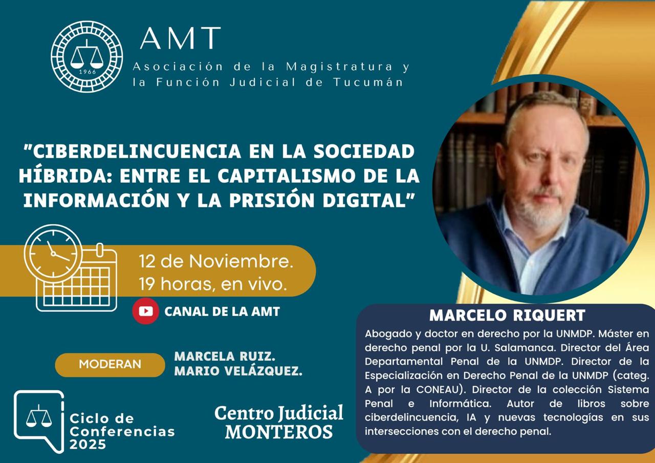 En la sexta edición del Ciclo de Conferencias de la Asociación de la Magistratura y la Función Judicial de Tucumán (AMT) junto al Centro Judicial Monteros, tendremos la actividad titulada «Ciberdelincuencia en la sociedad híbrida: entre el capitalismo de la información y la prisión digital» a cargo de Marcelo Riquert.